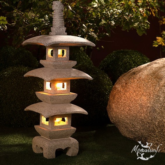 Lanterne pagode japonaise en granit véritable. 100 cm de hauteur, 11 éléments empilables pour un montage facile à 2 personnes. Pied en arche traditionnel, ouvertures pour éclairage LED. 75 kg de stabilité. Sur commande uniquement.