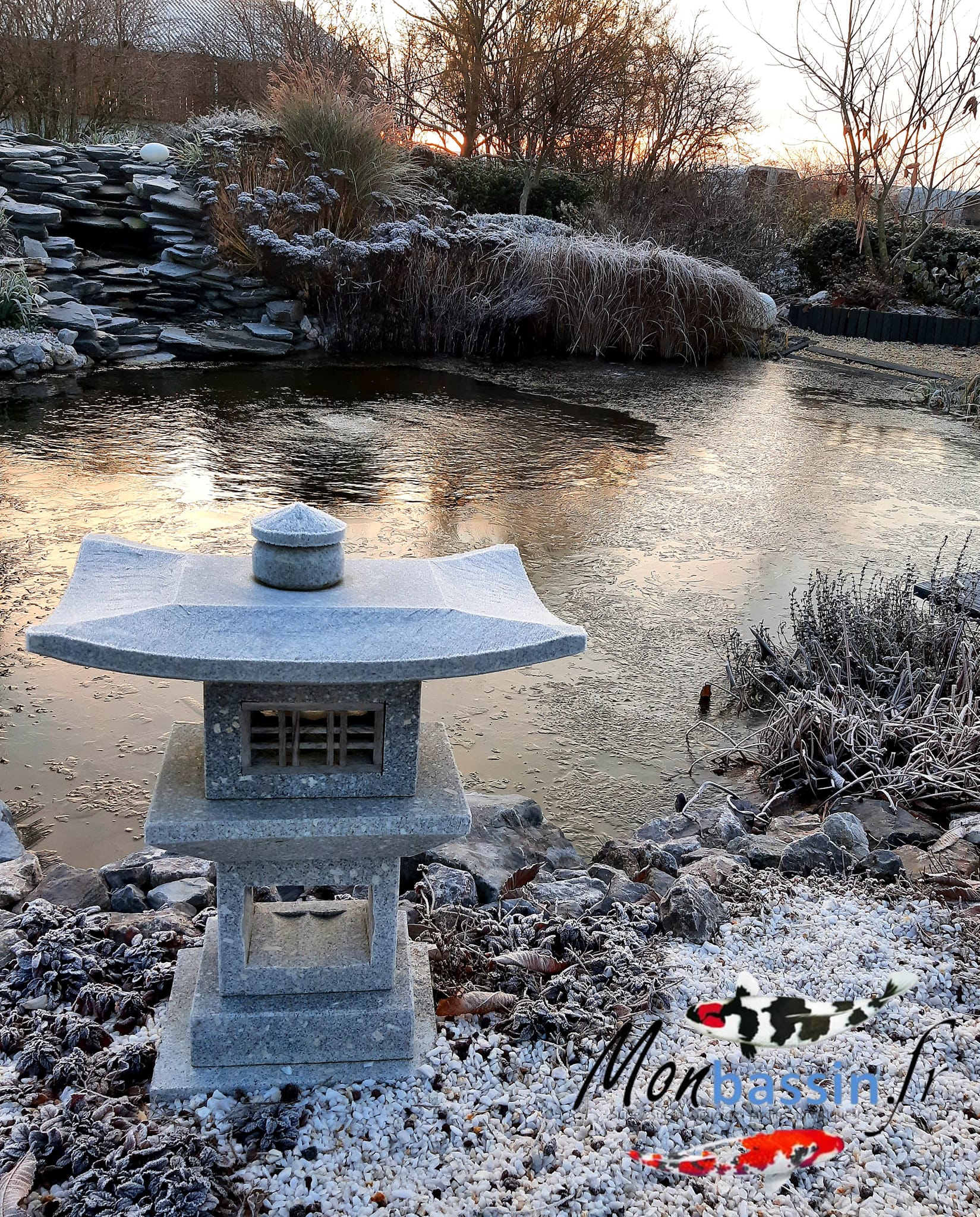 Les images que tu vois, c'est pas du catalogue. C'est chez mes clients. La lanterne dans le jardin zen avec le yin-yang en graviers. Celle au bord du bassin naturel en hiver. Celle sur le lit de galets dorés. Voilà comment elles vieillissent vraiment après quelques années.
