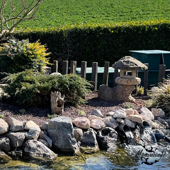 La Yamatoro est la lanterne qu'on choisit quand on veut un jardin qui a l'air d'avoir 100 ans. C'est le modèle qu'on installe sur nos chantiers de bassins naturels, au milieu de l'enrochement et des plantations. La photo en situation le montre bien : posée en retrait de la berge, entre les conifères nains et les roches, elle fait corps avec le décor.
