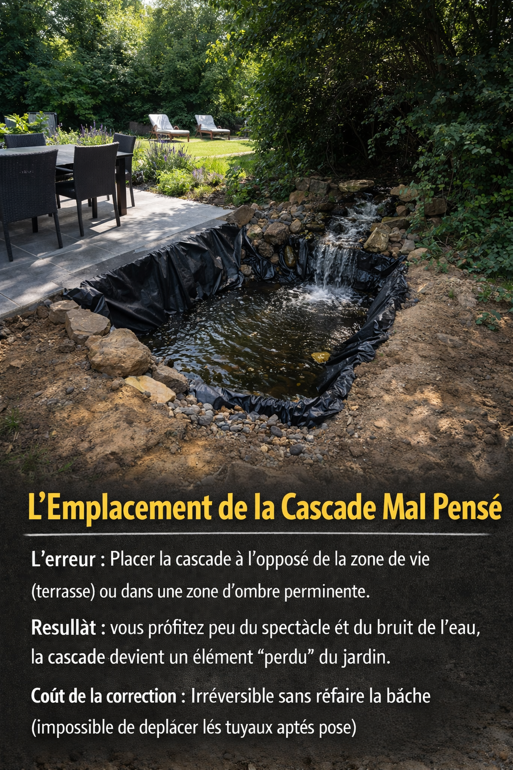 L'erreur : Placer la cascade à l'opposé de la zone de vie (terrasse) ou dans une zone d'ombre permanente. Résultat : vous profitez peu du spectacle et du bruit de l'eau, la cascade devient un élément "perdu" du jardin. Coût de la correction : Irréversible sans refaire la bâche (impossible de déplacer les tuyaux après pose)