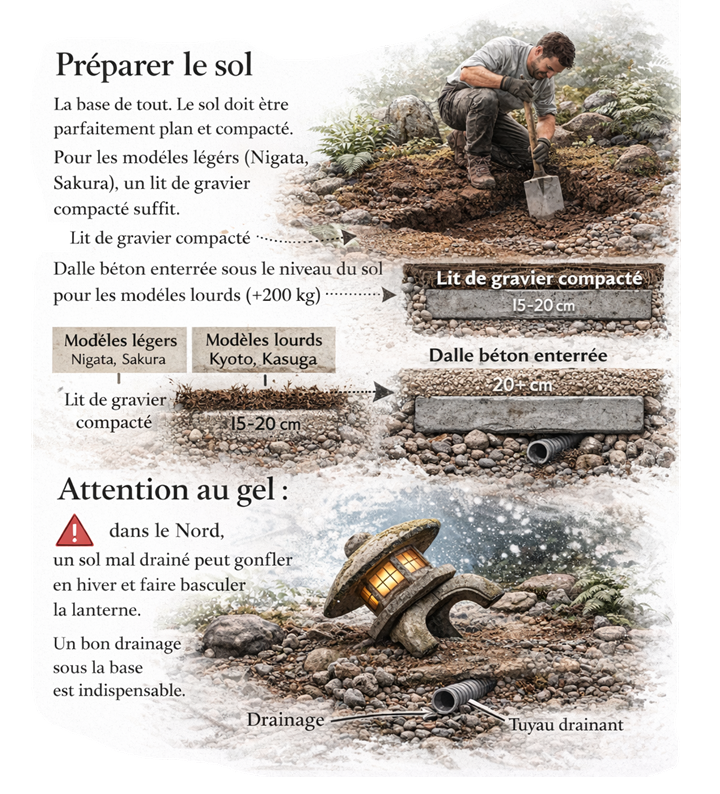 Attention au gel : dans le Nord, un sol mal drainé peut gonfler en hiver et faire basculer la lanterne. Un bon drainage sous la base est indispensable.